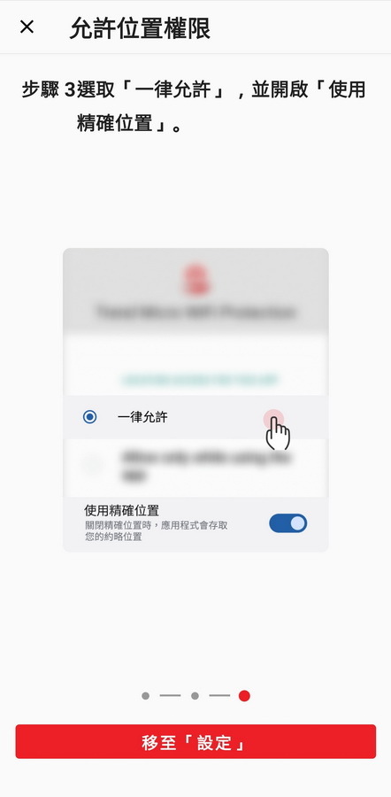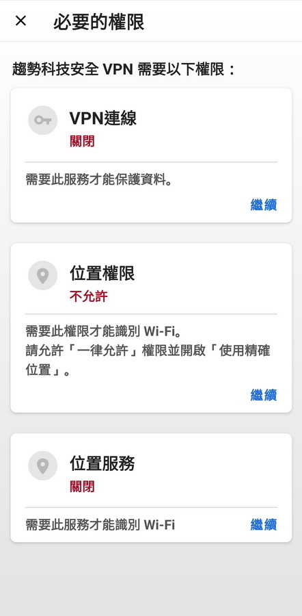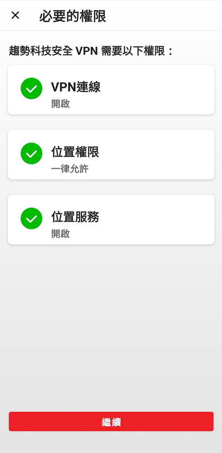 ▼ 接著會引導 使用 VPN,手機所需要開啟 必要的權限,全部設定完成後會顯示綠色的勾勾。