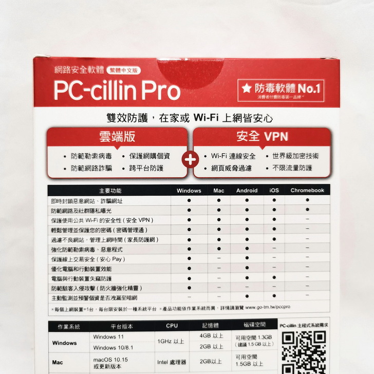 ▼ 盒裝背面 特別標註 PC-cillin Pro 雲端版 + 安全 VPN,下面也有列出各類裝置支援的功能。