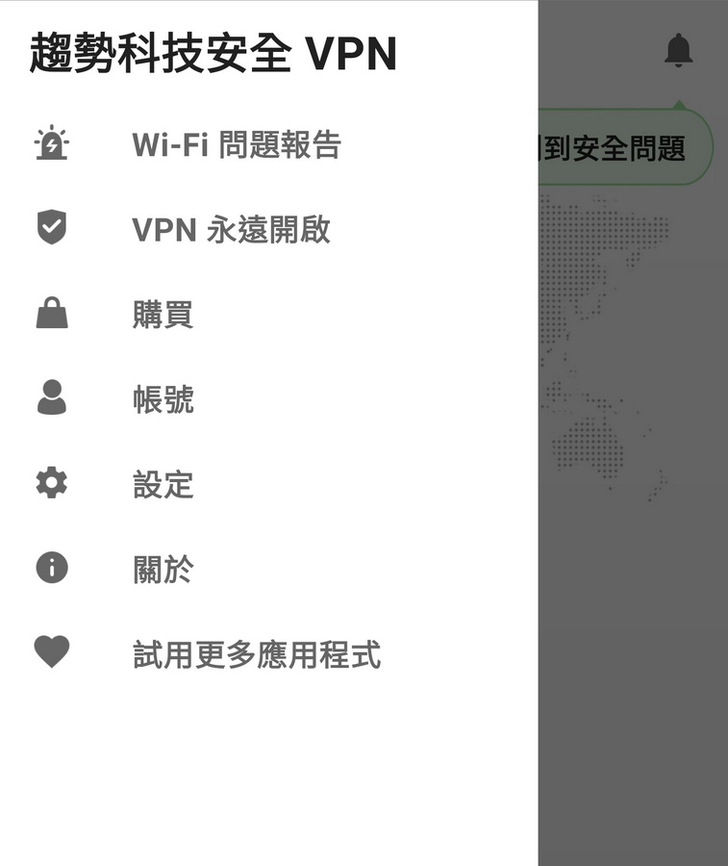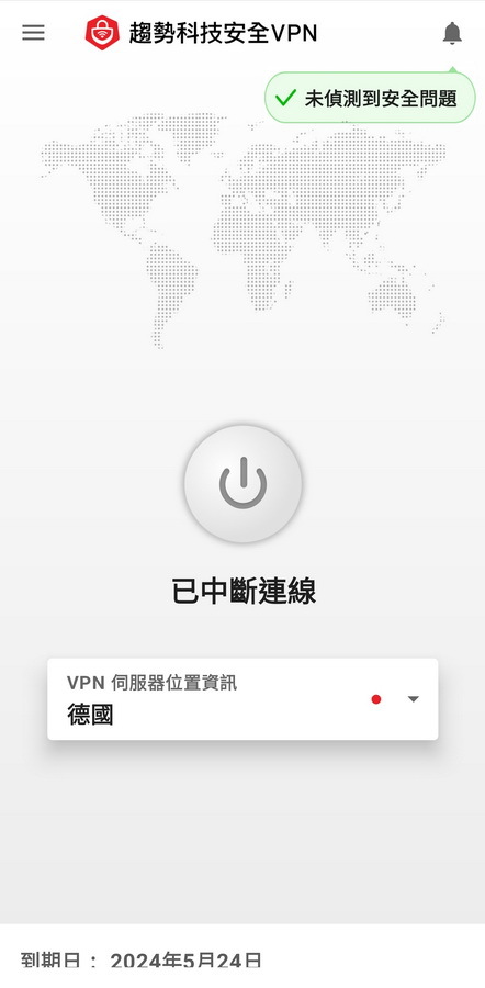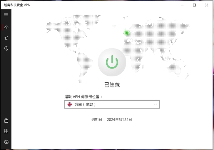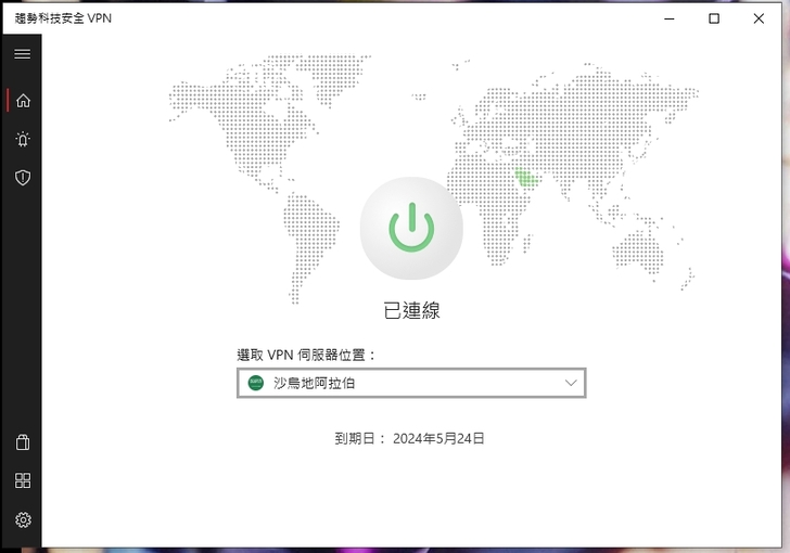 ▼ 此時只要開啟 趨勢科技安全 VPN,選取好地區及按下中間電源開關圖示,只要圖示呈現綠色,就代表 VPN 已經成功連結。