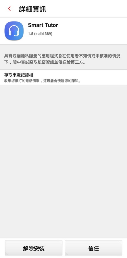 ▼ 點擊進去就可以看到該APP所造成的威脅,除了解除安裝外,如果確定該APP是沒問題的,也可以選擇信任。