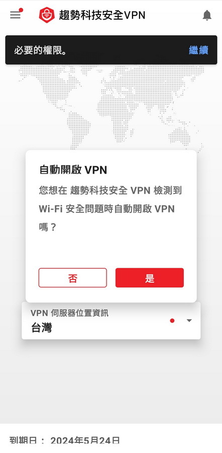 ▼ 趨勢科技安全 VPN 為了安全,會建議使用者只要偵測到 Wi-Fi 有安全問題時,自動開啟 VPN。