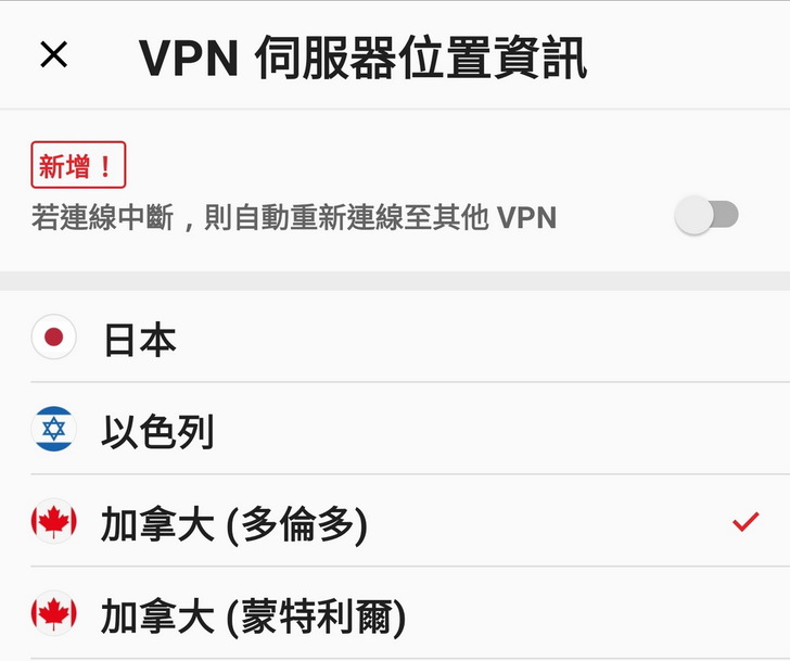 ▼ 有一個新增功能 - 若連線中斷,則自動重新連線至其它 VPN。