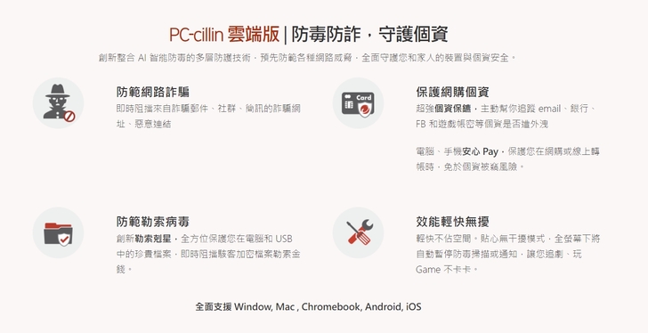 「PC-cillin 2024 雲端版」擁有「AI 智能防毒」技術,不論是電腦還是手機,透過可疑行為偵測技術,只要有一點點問題,系統馬上就會跳出通知告警,讓我上網購物更加的安心。