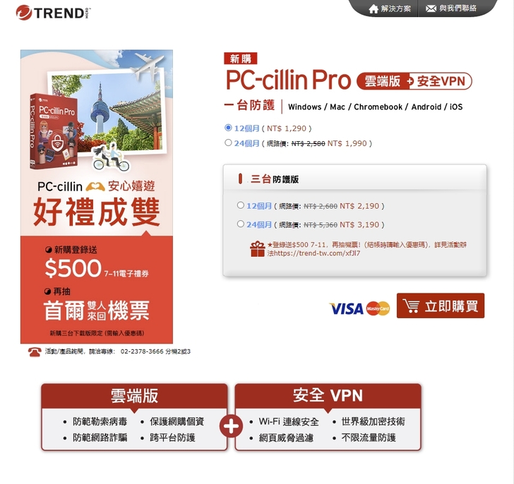 現在購買 PC-cillin Pro 登錄送 500元 禮券,還可以抽 首爾 雙人來回 機票。