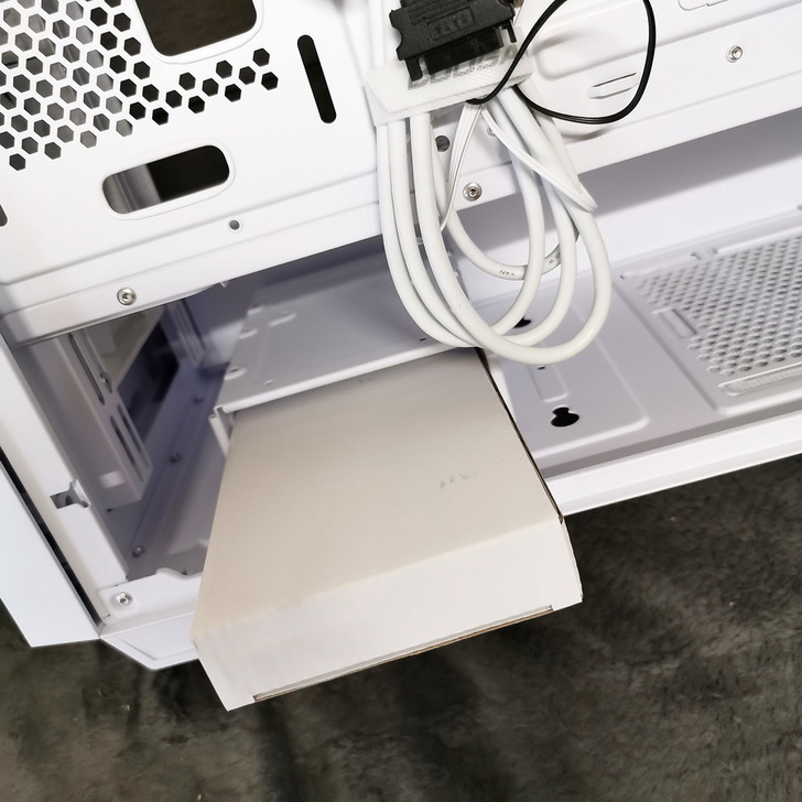 ▼ 配件盒 穩穩的固定在 3.5吋硬碟艙,配件盒裡面有 產品說明書、束線帶、各種固定螺絲。