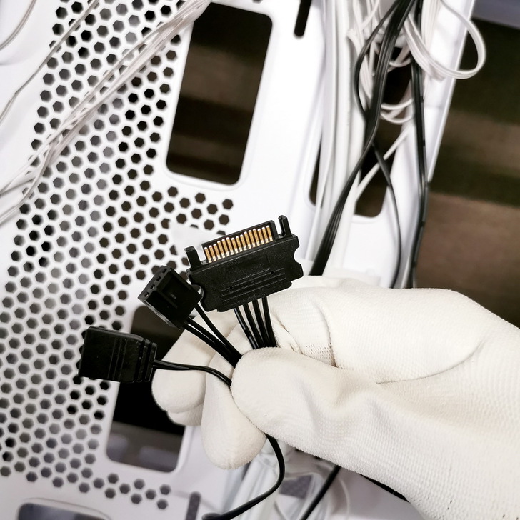 ▼ 雖然線材很多,但是使用魔鬼氈整理得非常好;可以看到中間可以安裝 兩顆 2.5吋硬碟;下方右邊是 電源供應器 安裝位置,左邊可以安裝 兩顆 3.5吋硬碟。