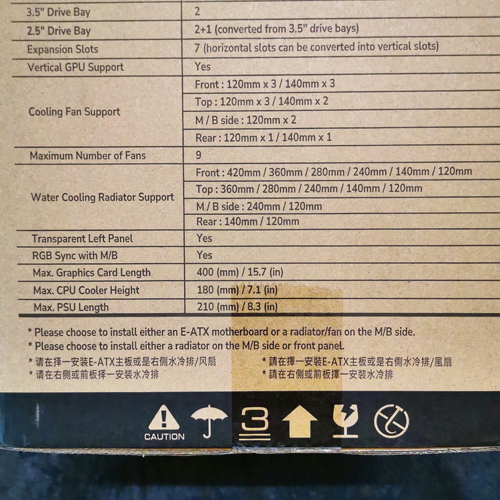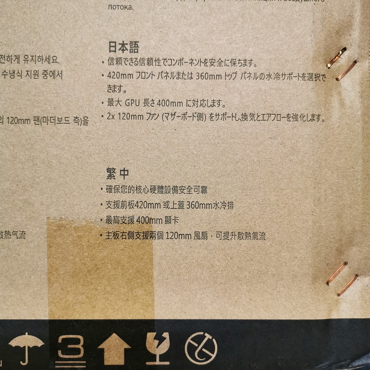 ▼ 外箱側面 除了有多國語言,另外標示產品基本規格,並有註明安裝 水冷排/風扇 注意事項。