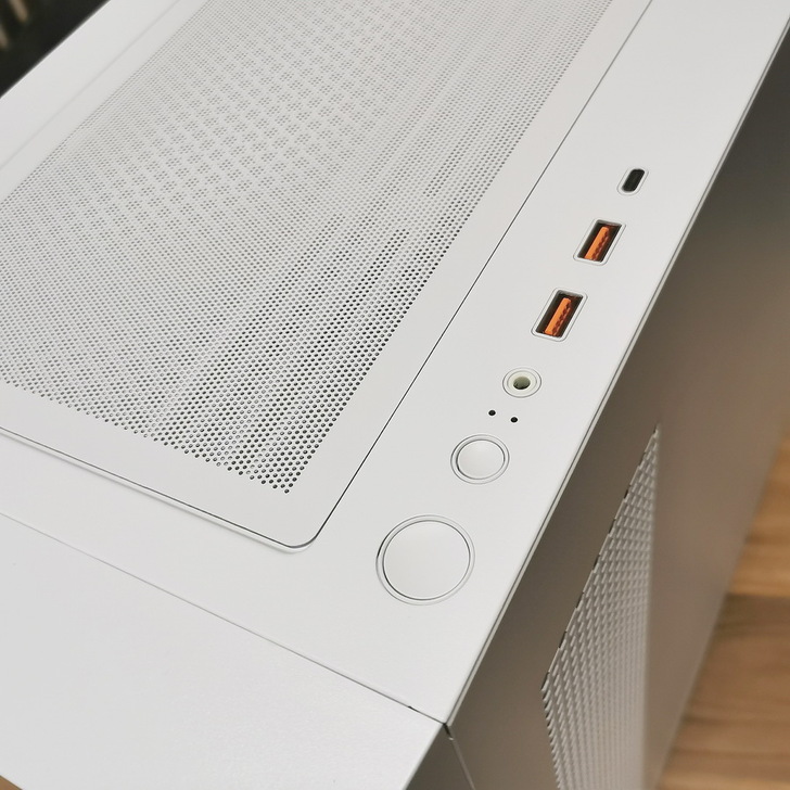 ▼ I/O 採上方設計 - 電源開關、RGB切換按鈕、HD音頻輸入/輸出插孔、兩組 USB3.2、USB3.2 Gen 2 Type-C。