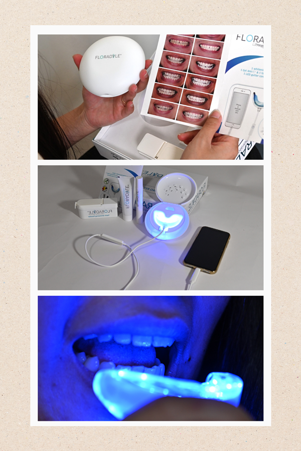 內容物有 LED照光牙托(牙套)、淨白牙粉、專用牙膏、美白筆
