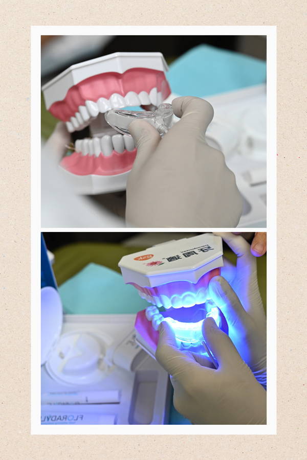 4. 將LED照光牙托戴在牙齒及嘴唇之間,照光10~25分鐘,完成後將取下即可