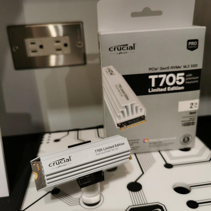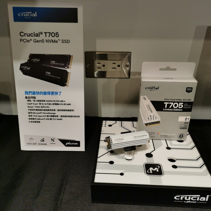 ▼ 現在最快的 Crucial T705 1TB PCIe Gen5 NVMe M.2 SSD,現場竟然展示白色散熱器版本,實在是太好看了。