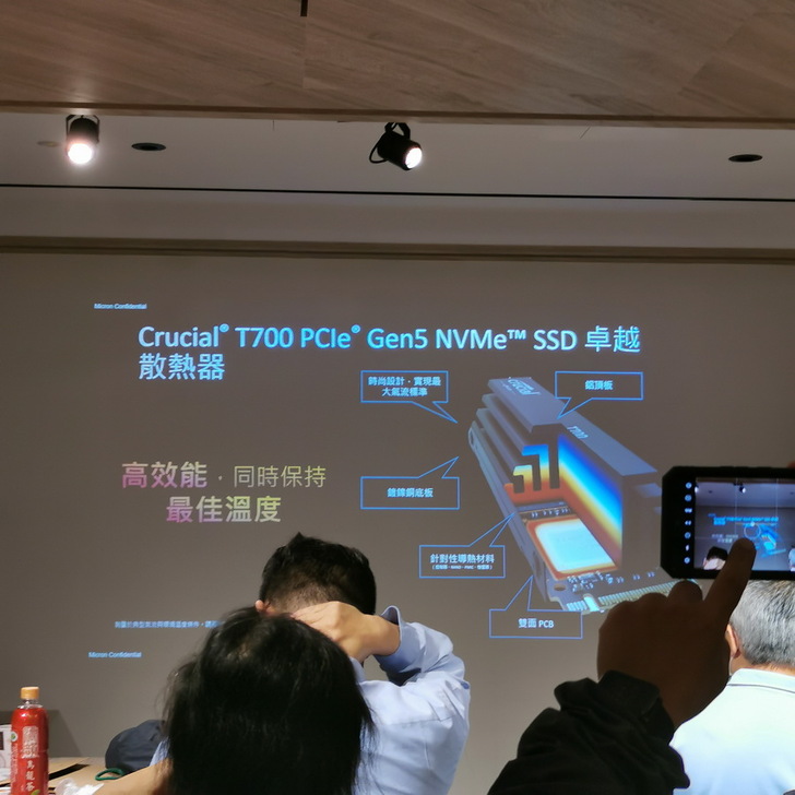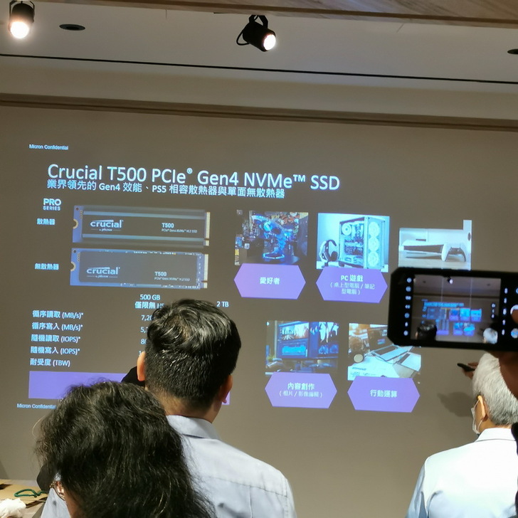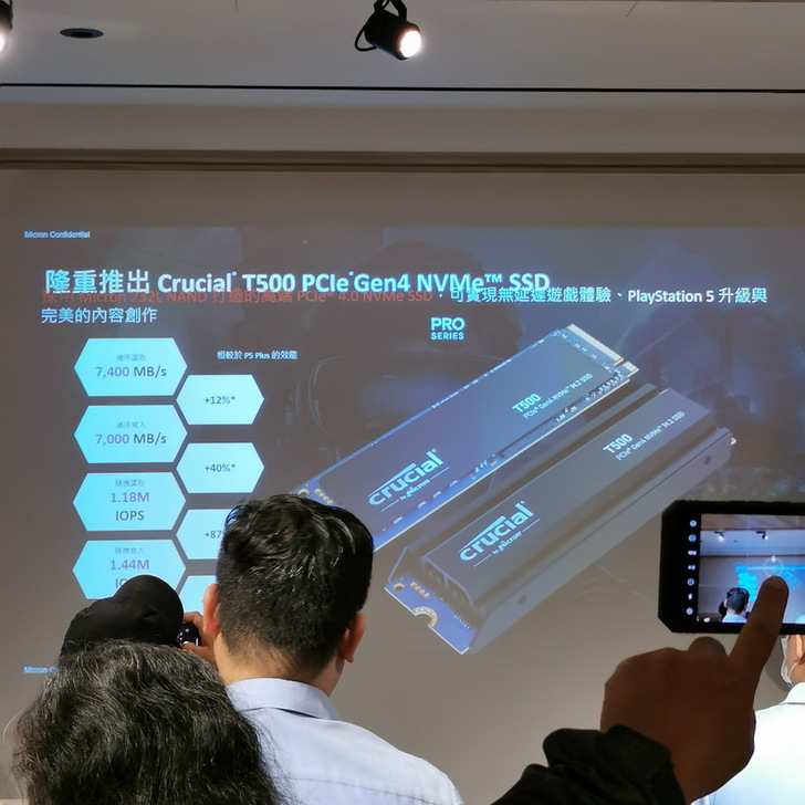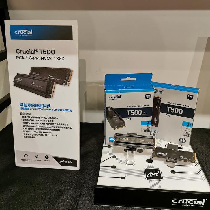 ▼ 一般人最能接受的 Crucial T500 1TB PCIe Gen4 NVMe M.2 SSD,現場同樣也是展示出有散熱器跟無散熱器版本。