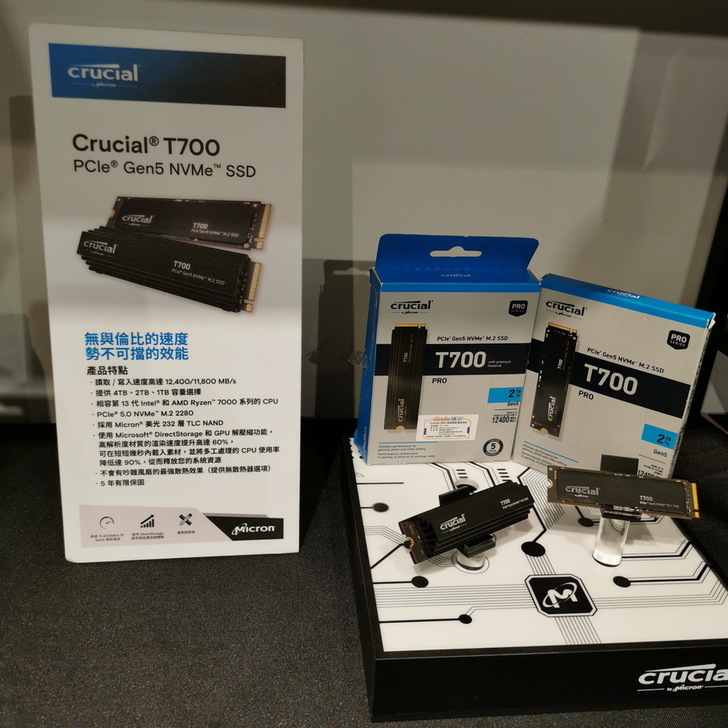 ▼ Crucial T700 1TB PCIe Gen5 NVMe M.2 SSD 展示出有散熱器跟無散熱器版本。