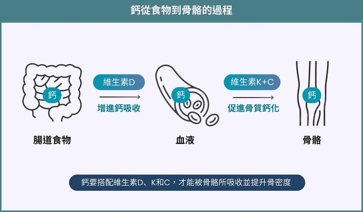 第3招 ‧ 挑選含有維生素C、D、K的複方產品:維生素D可以增進鈣吸收,幫助鈣從腸道運送至血液中。再搭配維生素K和維生素C促進骨質鈣化,鎖住鈣質提升骨密度,加乘鈣的運用。