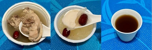 粉光香菇雞湯、百合銀耳棗甜湯、草本飲