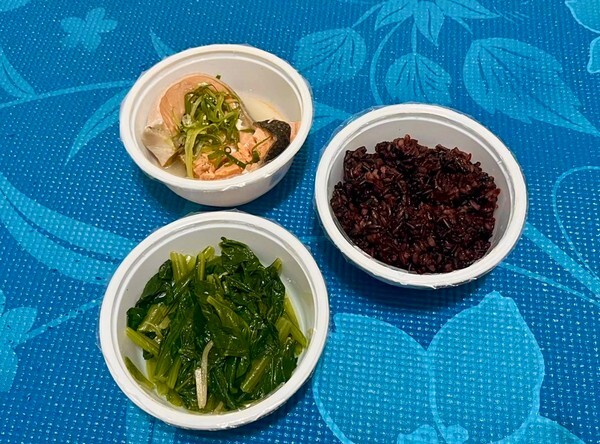 這份餐點吃的是黑米飯、薑絲小松、鮭魚