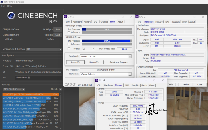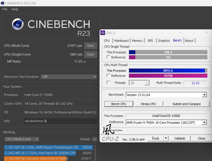 上面14500跟7600X相比,雖然用了較低一階的240水冷,不過溫度跟效能表現都較佳,估計14500在一般使用環境若用品質不錯的單塔散熱器就能有很不錯的表現,此外14500在CPUZ單線程效能超越7950X讓人有點驚訝。
