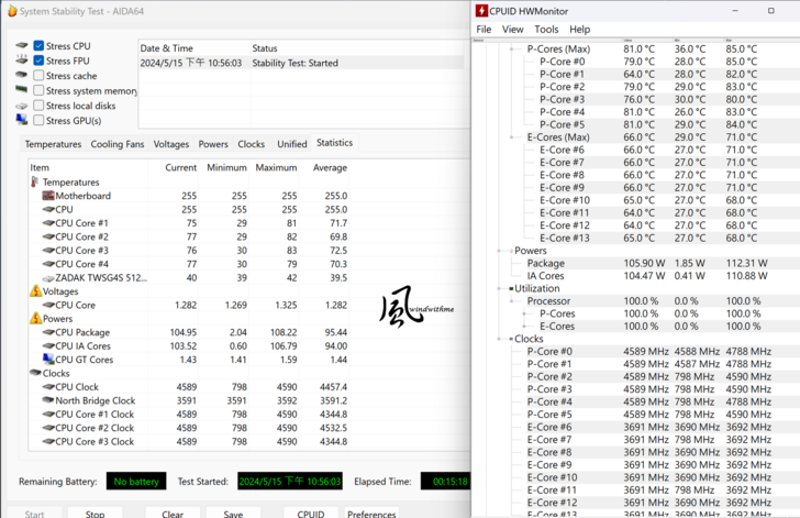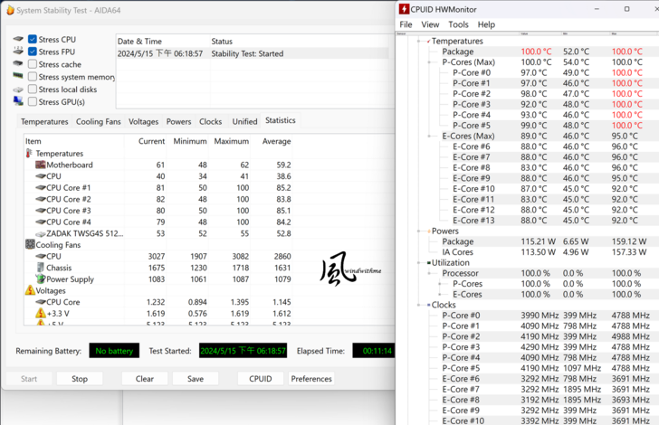 P-core約92~100度,時脈約4~4.3GHz;E-core約83~88度,時脈約3.2~3.4GHz。