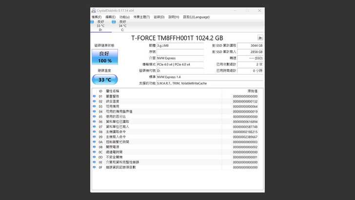 首先在 CrystalDiskInfo 中可以看到型號為 T-FORCE TM8FFH001T。PCIe Gen4 x4 傳輸模式。韌體為 3.g.J.M8。不同於之前使用鋁散熱片款的韌體是 3.g.J.LS。