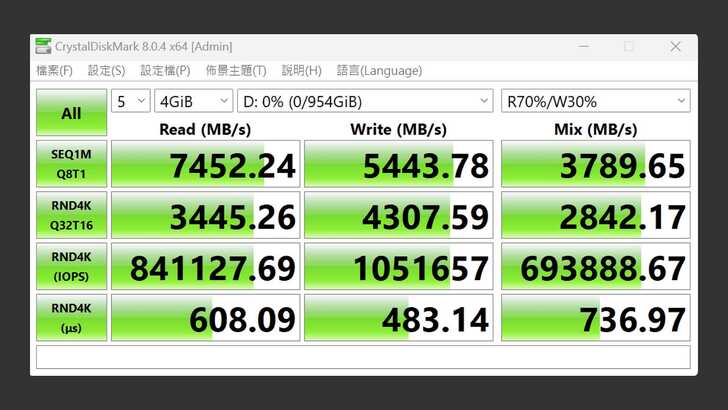 在 CrystalDiskMark 中,設定測試為五次 4GiB。最佳效能的設定下,循序讀取速度超過 7,000MB/s,來到 7,452MB/s。循序寫入速度有 5,443MB/s,混合讀寫速度也有 3,789MB/s 的表現。