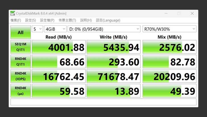 接著在 CrystalDiskMark 中,同樣設定測試為五次 4GiB,改為在真實世界的設定。循序讀取速度雖然有下降,但依舊有 4,001MB/s。循序寫入速度則幾乎沒變,是 5,435MB/s,甚至比循序讀取還快。混合讀寫速度為 2,576MB/s。