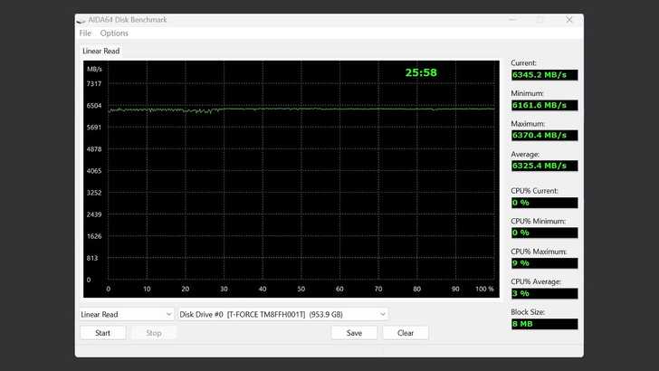 在 AIDA64 Disk Benchmark 中的 Linear Read,Block Size 為 8MB(平常設定是 4MB)。速度表現非常穩定,都在 6,000MB/s 以上。全碟讀取平均值為 6,370MB/s,容量為 953.9GB。