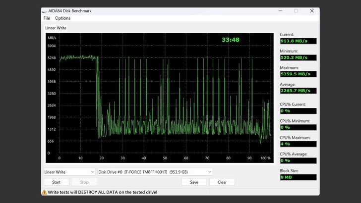 在 AIDA64 Disk Benchmark 中的 Linear Write,Block Size 設為 8MB(平常設定是 4MB)。可能是受到溫度影響,在寫入大約 17% 後,速度有比較大的浮動。不過最終平均仍有 2,000MB/s 的水準,普遍低點也在 500~1,000MB/s 之間。