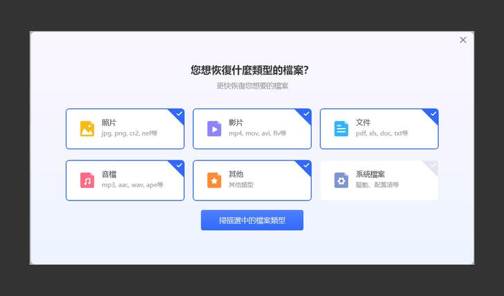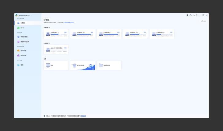 看到這款軟體的首頁,功能列於左側,包含磁碟、外接儲存裝置的資料救援、崩潰電腦的修復開機碟製作、損壞影片的修復和照片修復,基本上有關資料的功能都有提供。