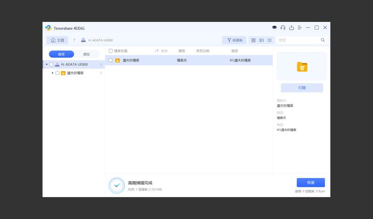 那麼格式化的情況呢?很遺憾的,於 exFAT 格式的 ADATA UE800 隨身碟上測試,丟入檔案後,分別以 Windows 的快速格式化與低階格式化將隨身碟清空後,Tenorshare 都無法將資料復原。其實,在實際使用時,是有成功救援格式化後的隨身碟,但不知為何,後續以測試隨身碟重現測試時,都無法重建結果。