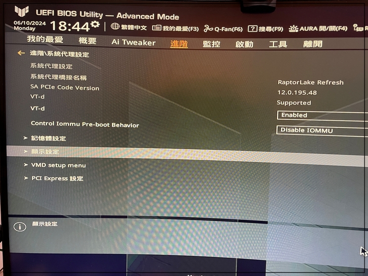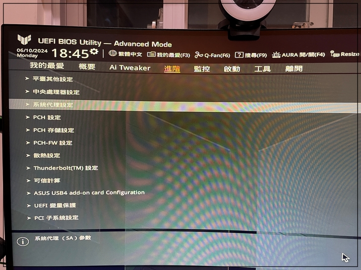 因為我原本使用的是內顯,所以要到BIOS裡面去更改輸出設定。以華碩UEFI BIOS為例,要先進入進階模式的系統代理設定分頁。
