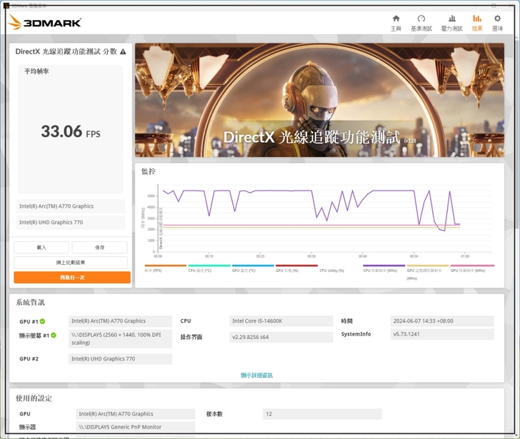 DirectX 光線追蹤功能測試用於測試專用硬體的即時光線追蹤性能,使用 DirectX 12技術,測試平均禎率為33.06FPS。