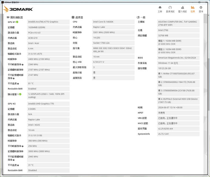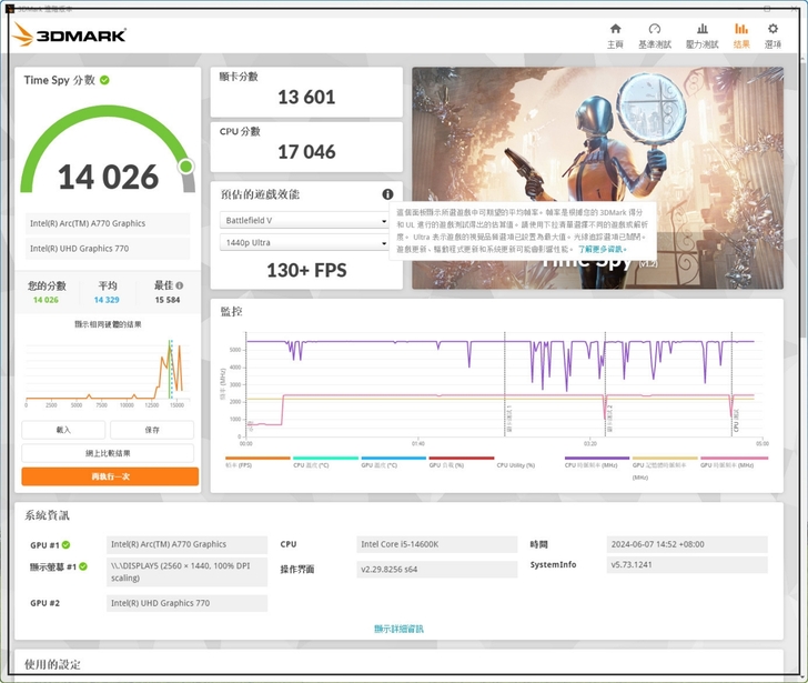 Time Spy 是採用 DirectX 12 API 所設計的測試情境,分別測試 1440p(2K) 與 Extreme 2160p (4K)的效能。測試成績是14026及6811。
