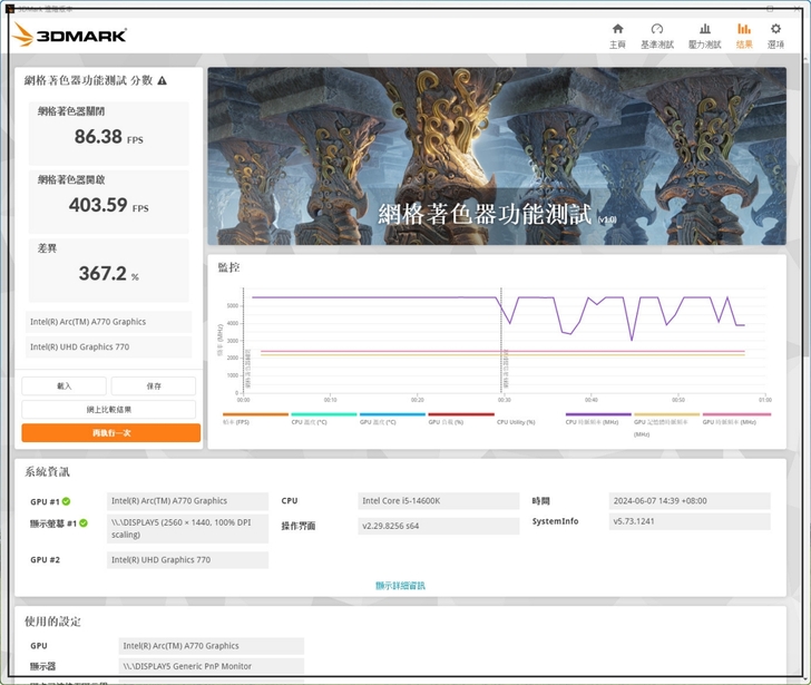 Intel XeSS feature test 透過開啟與關閉 XeSS設定進行兩輪渲染測試,來檢視 Intel XeSS 功能帶來的幀數提升,可以看出關閉跟開啟擁有51.0%的效能差異。