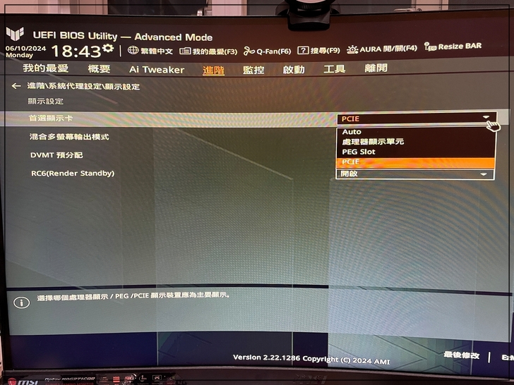 將首選顯示卡從原本「處理器顯示單元」改成「PCIE」。按F10儲存,重新開機後就可以了。