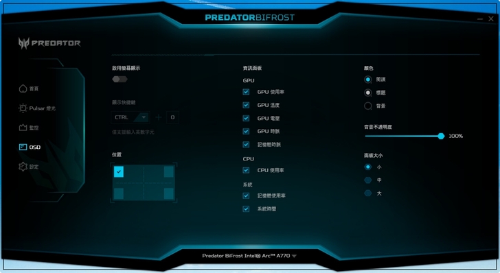 OSD設定,設定後會有小視窗浮動放在桌面位置,我自己是不太喜歡有小視窗擋住桌面,不過對於想要持續觀察監控資料時會很好用。