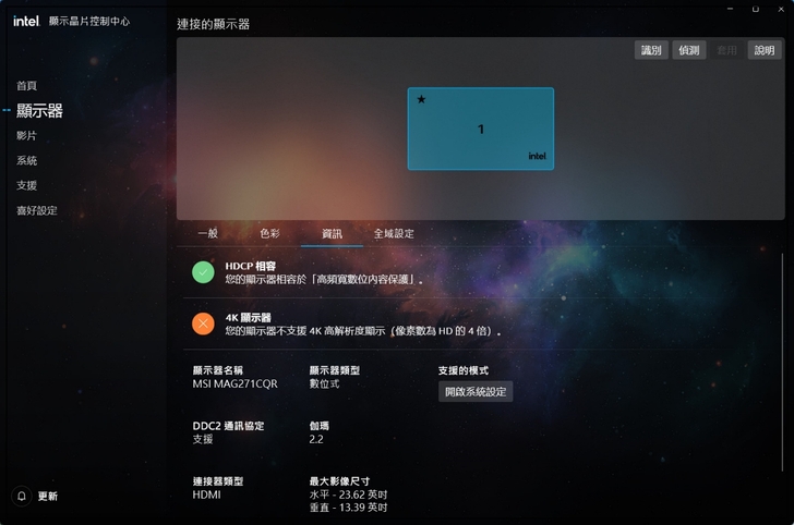 顯示器資訊,因為我目前的螢幕並不支援4K,這也是我最終選擇A770 Arc的原因。