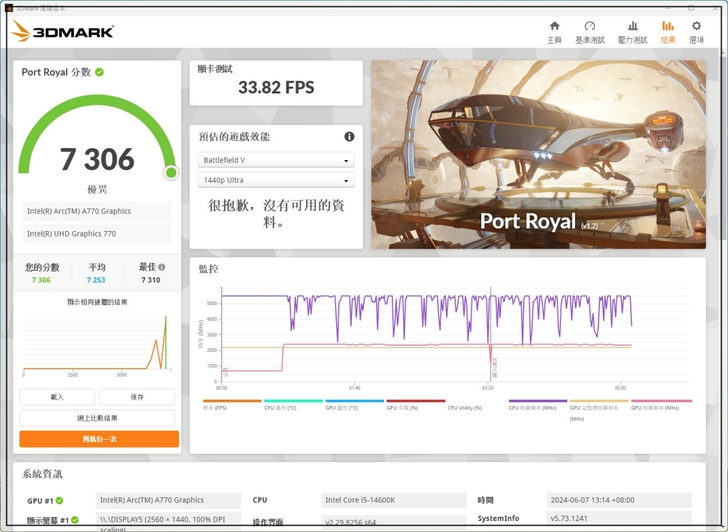 Port Royal是3D Mark第一款針對遊戲玩家所推出的即時光線追蹤基準測試,測試項目為 DirectX 12 DXR API,在 2K 畫質測試內添加 DirectX Raytracing 即時光線追蹤以及 DLSS,測試分數獲得 7306 分。