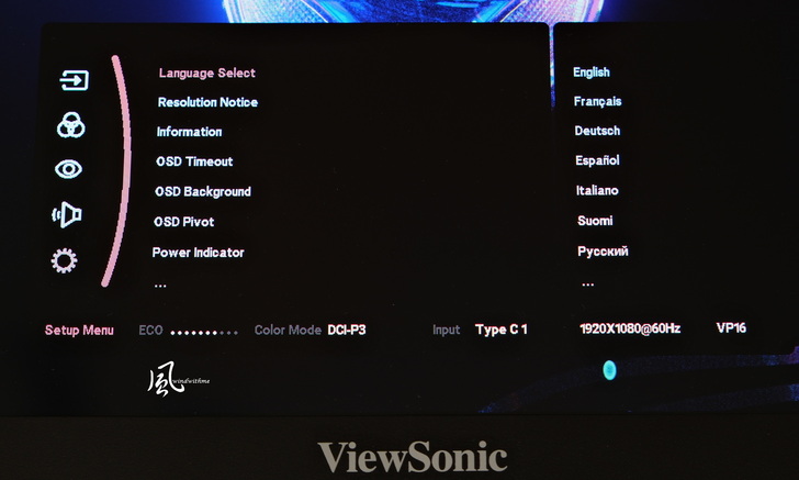 VP16-OLED螢幕上左右3側為窄邊框設計,採用OLED面板,可視範圍為15.6吋、表面為眩光搭配硬塗層、解析度1920 x 1080。