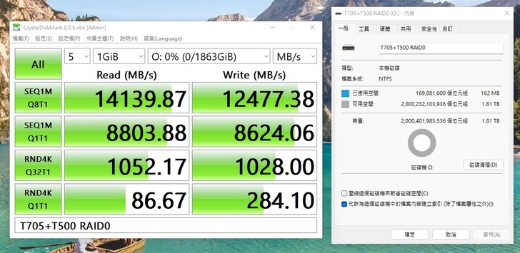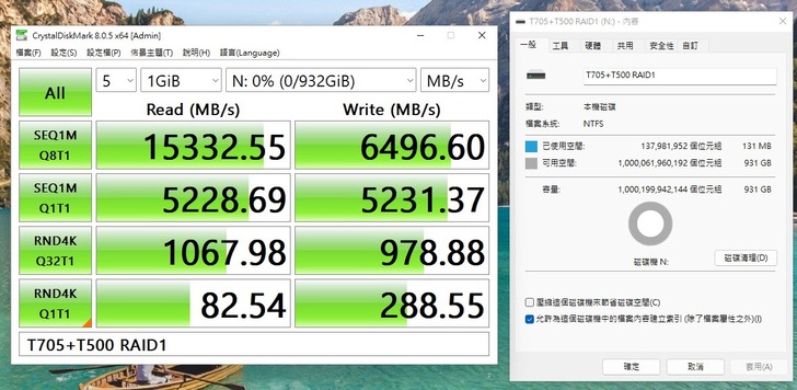 改組使用RAID1方式,其部分讀寫效能會受限於T500的Gen4頻寬