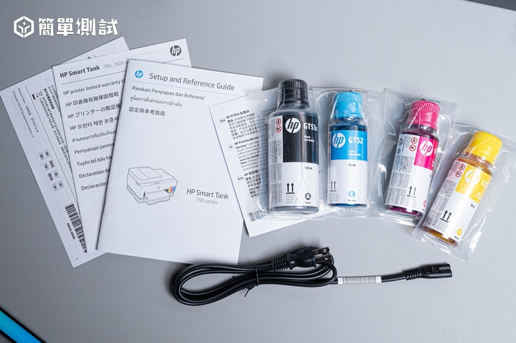 拆開盒裝紙箱,內附設定與參考指南、保固聲明書、墨水警示傳單、4 罐原廠墨水顏料、八字電源線(100cm)。