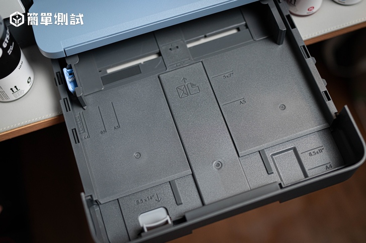 至於紙張的尺寸極限,就是最常見的 A4 尺寸。這邊有很重要的一點:若要印製相片,需要讓相對更亮白的光亮面方向朝下裝載進紙匣;同理,要回收利用舊紙空白面的話,就要把空白面朝下放入進紙匣,這才是正確的使用方式!另外,若在途中插入其他紙張,只要放在進紙匣最上方即可,進紙匣的吃紙順序是由最上面往底下吃;紙張的頭尾方向則是靠近印表機的短邊為紙張下半部。