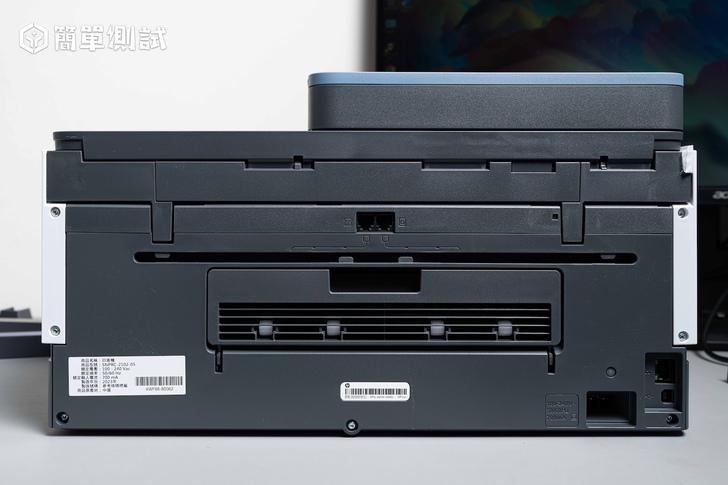 看到背面的中央位置部份,左邊是電腦撥號數據機,右邊是 26 AWG 電話孔,底下還有一排內凹進去的電話線走線槽,這 2 孔就是身為旗艦 Smart Tank 795 獨有的傳真功能。底下一塊可以掀起的後方擋門,平常處於闔上狀態,如果有卡紙問題就可以掀開來排除狀況。右下角有一顆內凹進去的 Wi-Fi 按鈕,旁邊有 100M 乙太網路孔,其下方一孔 USB-B 連接埠,旁邊則是電源插槽,電壓支援 100V - 240V 全球通用!