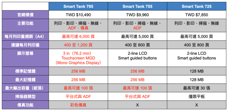 ❑ 傳真功能:只有 Smart Tank 725 搭載彩色傳真功能,剩下另外兩台沒辦法使用傳真功能。