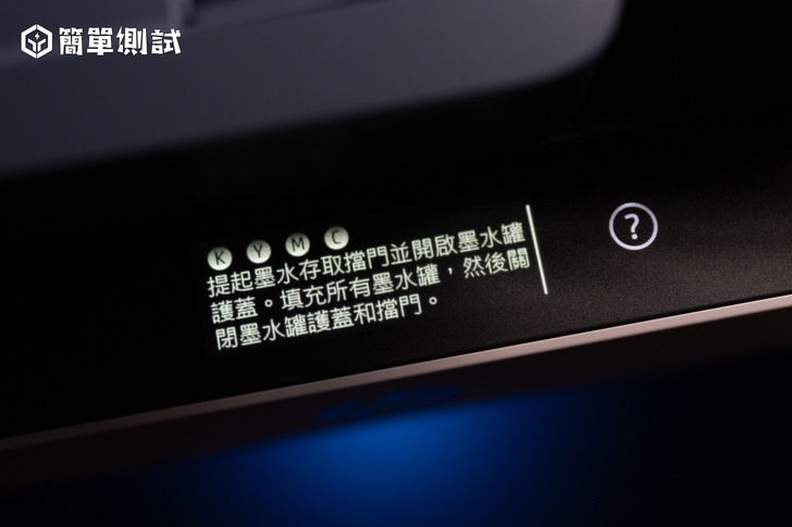 從正面看過去,有便於判斷剩餘容量的黑、黃、紅、藍 4 色墨水匣。在開機狀態會同時恆亮印表機狀態提示燈,不同狀態會閃爍不同的顏色燈號。左下方則有一顆實體的電源按鍵,點按一下就能開機或關機。底下則是 USB-A 2.0 連接埠,如果辦公環境的網路狀態有異常,一樣能以 USB 連線方式來執行列印及掃描任務,也能透過這孔 USB 把文件掃描到隨身碟內。