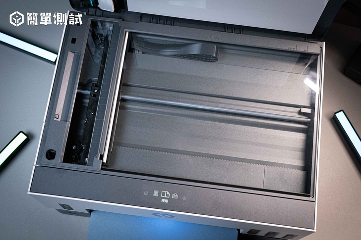 掀開頂蓋,這部份是掃描器玻璃板,旁邊會持續閃爍掃描綠燈,四周也有尺寸標線做作為掃描定位。需將要掃描的原稿文件朝下放置在玻璃板,並且對齊左上角位置,再蓋下掃描器蓋板就能執行掃描作業。不過就算沒有蓋上掃描器蓋板也能進行掃描動作,這邊注意一下。