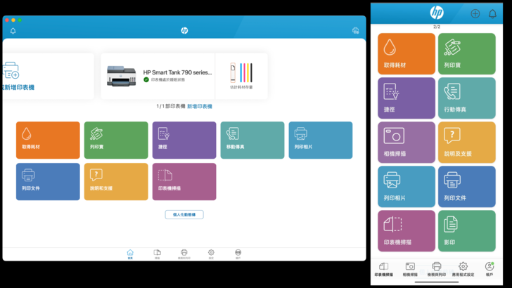在軟體方面,HP Smart 提供了 macOS、Windows、iOS、Android 諸多作業系統,支援度非常全面。在手機 App 上,除了「印表機掃描」、「影印」這 2 個功能一定要跟印表機在同一個 Wi-Fi 環境才能使用之外,剩下的功能都可以靠行動網路來遠端列印或掃描文件。而且不管是手機 App 還是電腦軟體,墨水狀況都是一目瞭然直接秀在首頁上,完全不擔心列印任務中的墨水量會突然不夠用。