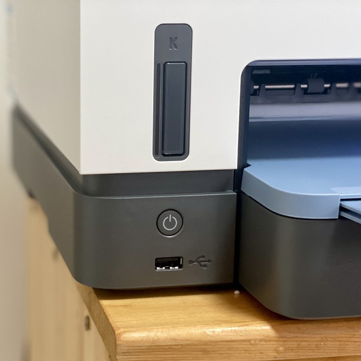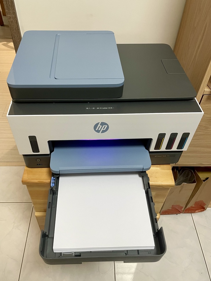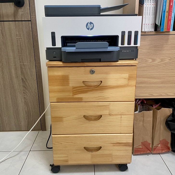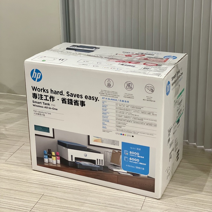 其實機器本身非常小巧「HP Smart Tank 795」是7系列中的旗艦款,包含影印、列印、掃描、雙面列印、網路連線、傳真等功能,外觀上體積是我目前見過全功能中最小的機型,只需要三層抽屜櫃就能放置他,舊機器佔用的桌面空間立刻被解放啦!