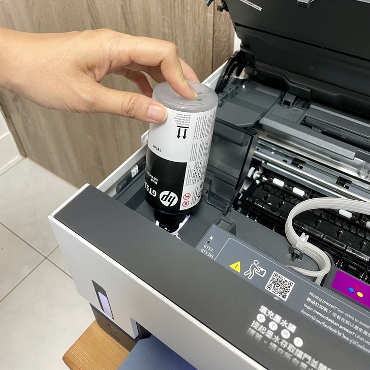 墨水容量非常大,可以支援8,000 頁彩色和6,000 頁黑白的墨水印量,更解決補充墨水最怕的髒手問題,不像過去要更換墨水匣,可以直接倒入墨水孔中,靜待補充完成。