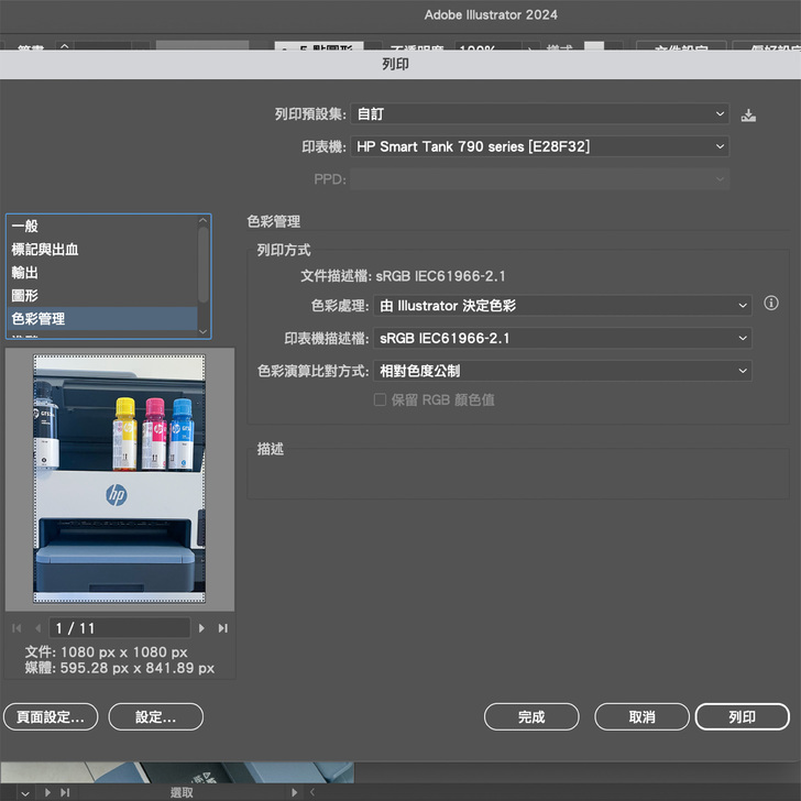 我的插畫顏色彩度比較高,因此我對色彩的要求也特別挑剔哈哈。之前試印過其他列印機,要馬彩度太低,要馬CMYK其中一色偏得很誇張,而HP Smart Tank系列相較之下比較沒這個問題,以我的圖來說它的色彩還原度算高的,只需要稍微做微微調整。