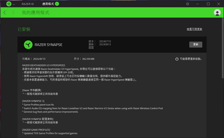 ▼ 因為早就裝過 Razer Synapse 3 軟體,果然馬上就跳出有更新通知。